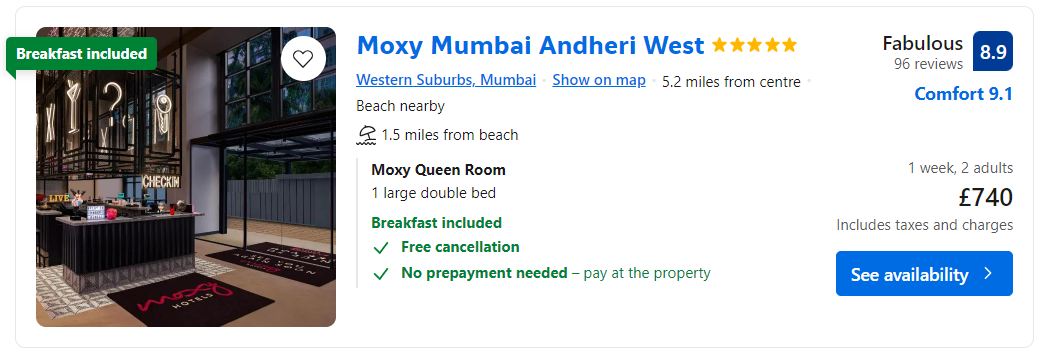 The Moxy Mumbai Andheri West is a vibrant and contemporary hotel located in Mumbai's bustling Andheri West district, and boasts modern rooms, and free breakfast!